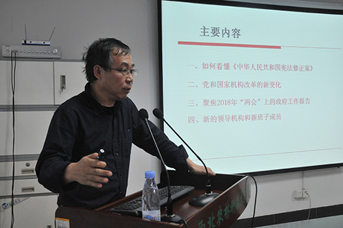 为学习贯彻“两会”精神,进一步深入领会《宪法修正案》、党和国家机构改革的重大意义,增强职工的宪法意识,使职工成为宪法的崇尚者、遵守者和捍卫者.4月18日,我院邀请人文学院方建斌教授作全国“两会”精神辅导报告会,党总支书记颜玉怀主持报告会,我院全体职工聆听了报告。