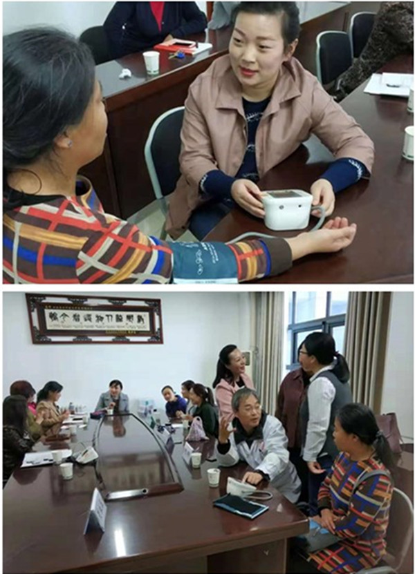 随后,医院医师和教职工展开交流,现场答疑并进行一对一的健康指导,为参会职工测量血压。