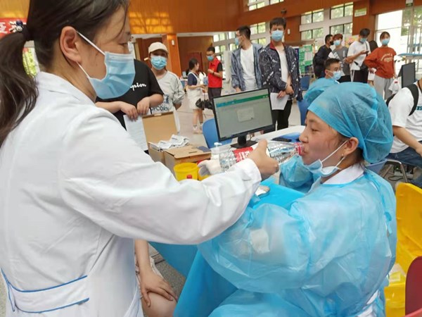 12、13日2天时间医院就完成了原定3天的接种任务,接种5600名师生。这2天,医院工作人员每天上午8点准时到达指定岗位,做接种前的准备工作,上午9点开始接种,直至晚上9点完成最后一批接种师生留观后,再对当天的接种信息进行验核和统计,清理接种现场,梳理总结工作,每天工作时长达14个小时。特别是穿着防护服的接种工作人员,完成接种工作脱下防护服,里面的衣服已全部浸湿……