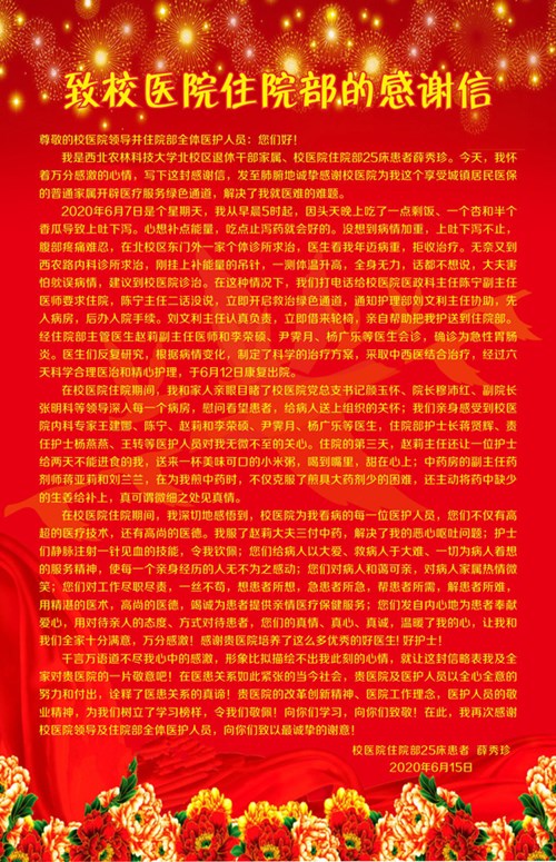 今年6月,我校退休干部家属、76岁的薛老师因饮食不当患急性肠胃炎上吐下泻,在被2家诊所拒收后求助我院,医院立即开通绿色通道收入老年科病房,对其精准施治,精心护理,住院6天老人康复出院。“你们用对待亲人的态度、方式对待患者,你们的真情、真心、真诚,温暖了我的心。”薛老师在感谢信中这样写道。