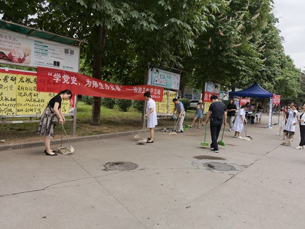 活动前,联合党支部对活动进行了精心策划,准备了笤帚、簸箕等卫生清洁工具,制作了健康宣教彩页。31日下午4点,党员们准时在西雕广场集合。大家积极行动,在宿舍区、食堂、操场等学生集聚区捡拾烟头、清扫树叶,还有部分党员为过往师生发放宣传彩页,进行健康宣教。