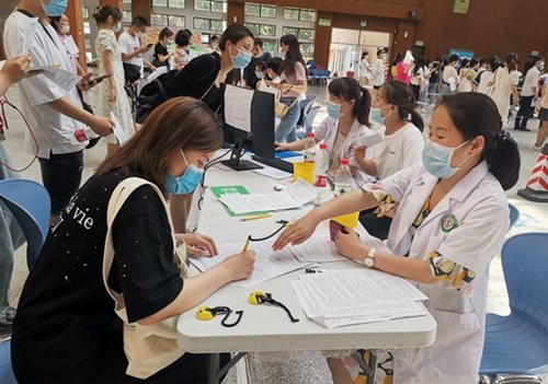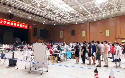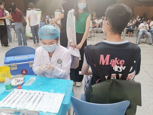 14日是端午节,接种工作未因节日受影响。“虽然很累很辛苦,但是能为校园安全和师生健康出一份力,这个端午节我们过得特别有意义!”校医院工作人员说道。