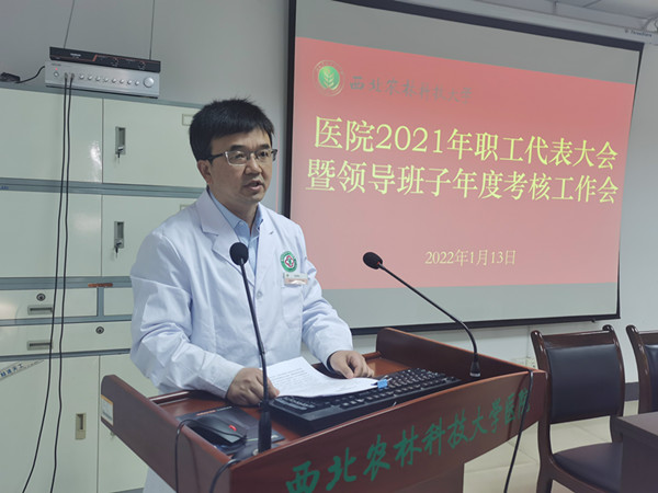 党总支书记刘西平作总结发言,肯定了2021年医院工作取得的成绩,强调2022年,全体职工要紧扣学校立德树人根本任务和医院保障师生健康中心工作,铆足干劲,全力以赴推进医院各项工作全面迈上新台阶。